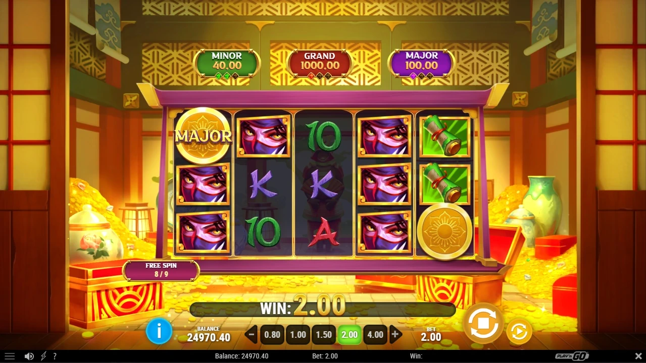 Besides low paying card symbols and medium to high paying ninja weapons, you will also find wild symbols on all reels. There are no normal scatter symbols, but there are three different colored coins on all reels which are needed to trigger a bonus.