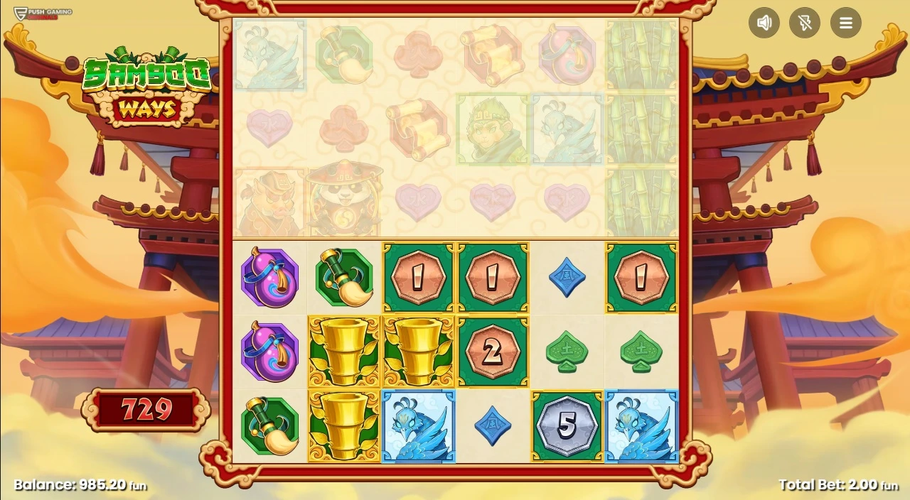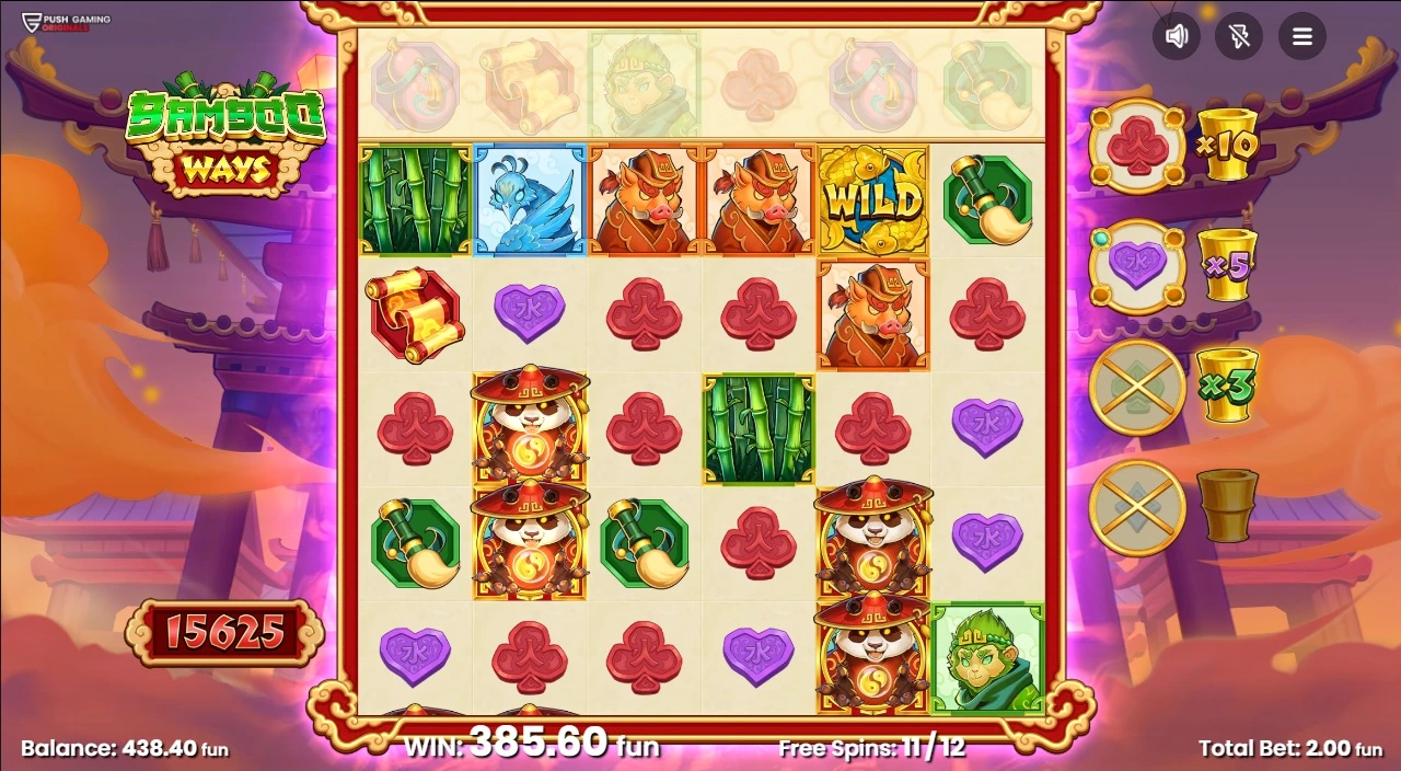 Bamboo Ways uses tumbles, or reactions. Which means that winning symbols are removed from the reels and new symbols are added on top. Each time a winning combination appears and the symbols are removed, the reels grow by 1 symbol, up to a maximum of 3 extra symbols per reel. A maximum of 6 symbols per reel can be active, awarding 46.556 ways. During the base game, on a new spin, they reset back to 3 symbols per reel.