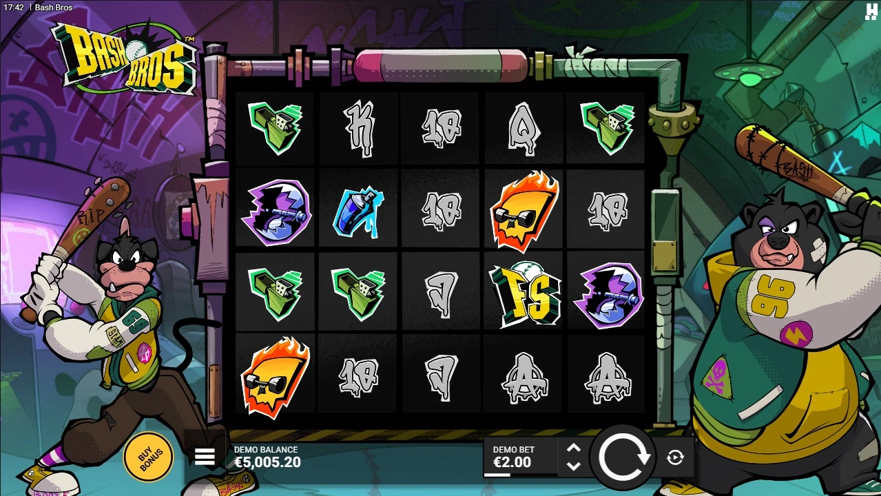 Bash Bros offers several bonus buy options. For 3x the bet you can activate a 5 times higher chance of triggering the bonus. 50x the bet will guarantee you to land at least one Cash Stack. For 50 times bet you can buy 3 scatter symbols and for 200 times bet you are able to buy 4 scatter symbols. The 5 scatter bonus isn’t available to buy.