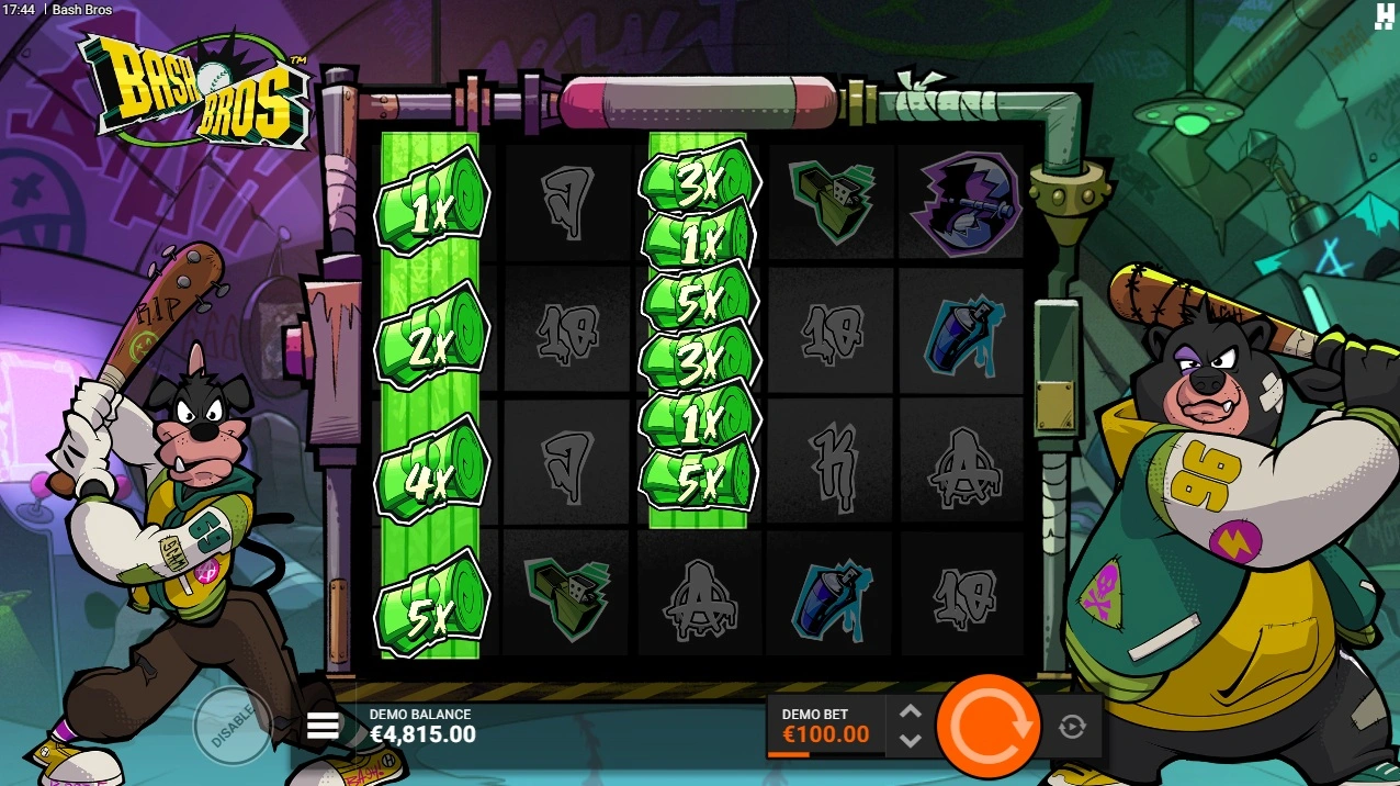 Besides low paying card symbols and medium to high paying symbols like a lighter, bear trap and spray paint can you will also find scatter, or free spins symbols on all reels. There are no wilds on Bash Bros, but there are special Cash Stacks, that can also appear on all reels.
