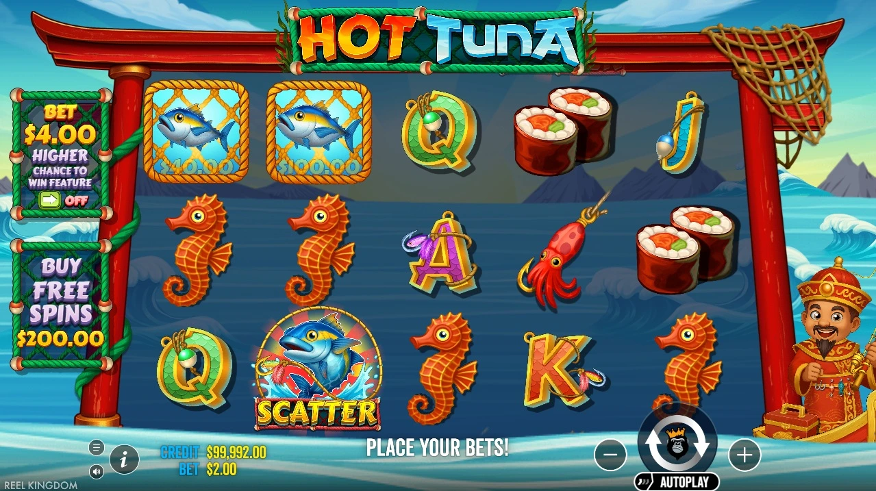 We know find an Asian themed fishing slot with an Asian fisherman next to the reels and instead of normal fish, we are going for tuna and the, extremely rare, hot tuna.