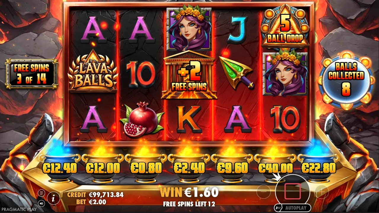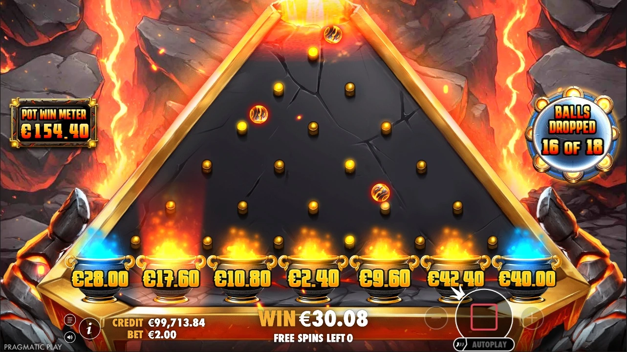 On reel 1 a special Lava Balls symbols may appear and on reel 5 a Ball Drop symbol may appear. When both are present during a spin, between 1 and 100 balls are added to the balls meter. After all spins are done, the number of collected balls will now drop down and land in the pots with the values. The total of free spins and all balls is then rewarded.