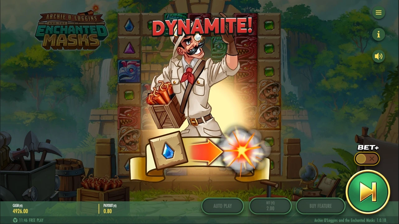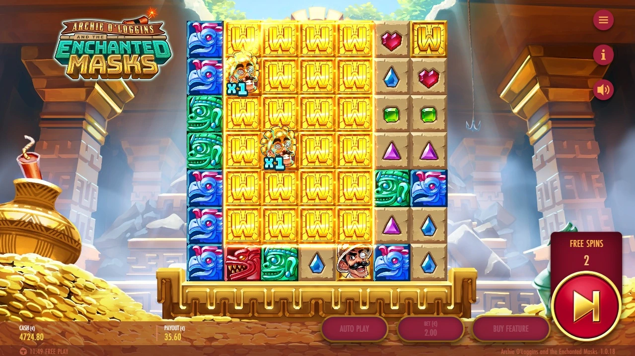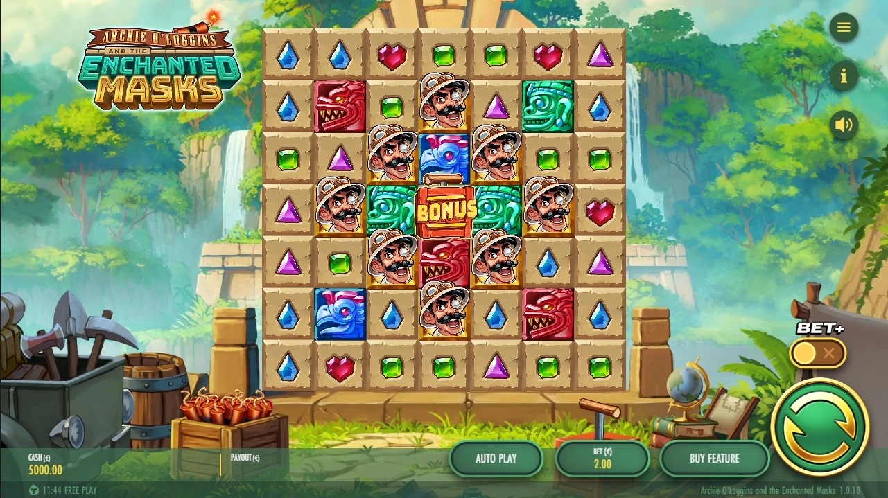 Archie O’Loggins and the Enchanted Masks comes with a big maximum payout of 10.000 times bet and is a high volatile slot game.