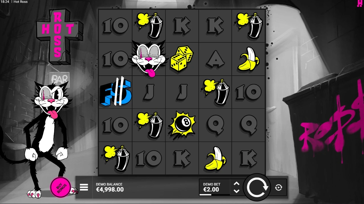 Ross is a classic cartoon looking cat and the game’s theme comes with a lot of black, with pops of pink and yellow. It makes for a pretty good looking game and somehow instantly recognizable as a Hacksaw Gaming slot game.