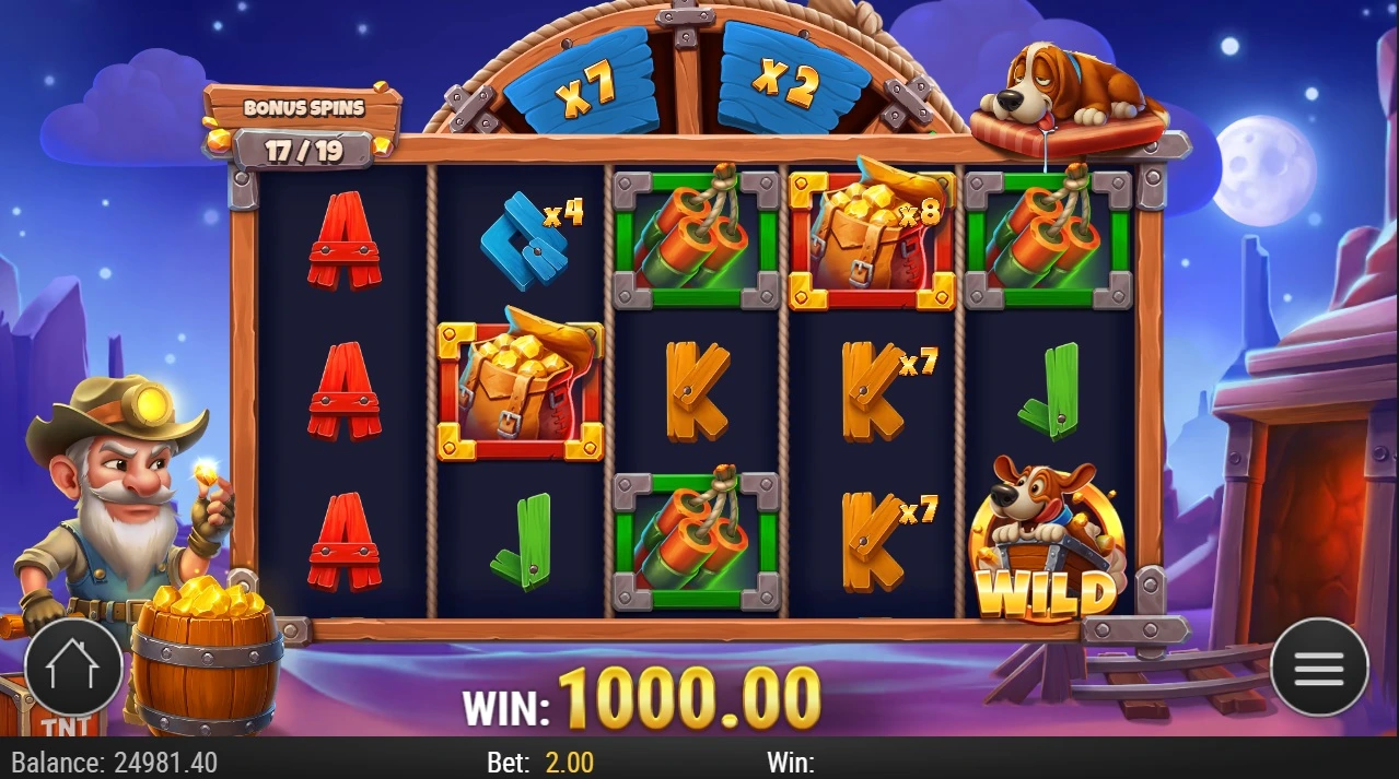 So as you might imagine, you will find a miner, gold nuggets and dynamite. But also with a cute dog.