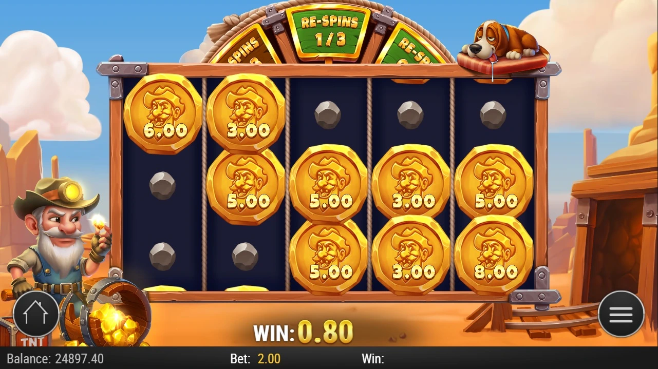 Each time you land one or more coins, but no more than 5, they are collected by the miner next to the reels. At any point when at least 1 coin is collected, the wheel bonus might trigger.