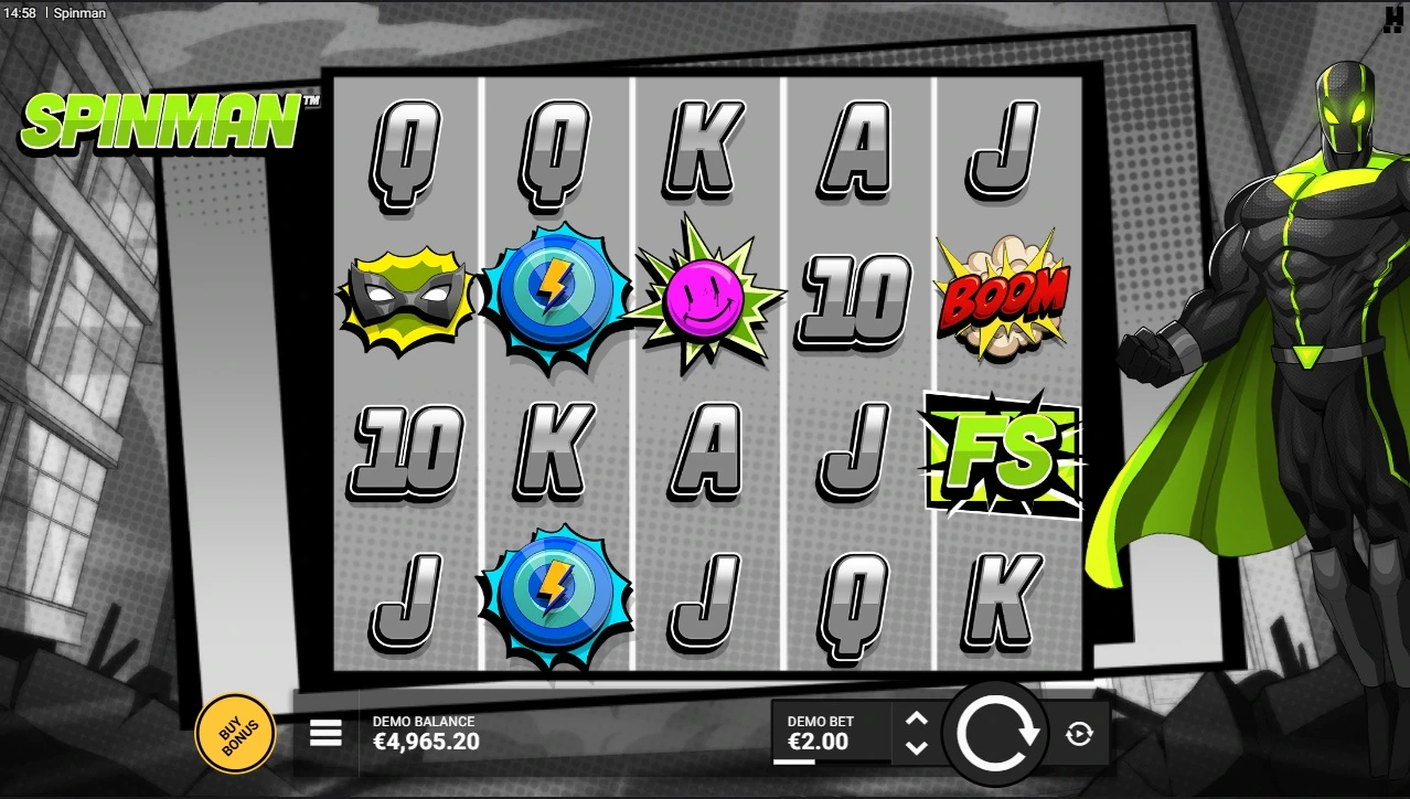 Spinman offers several bonus buy options. For 3x the bet you can activate a 5 times higher chance of triggering the bonus. For 50x the bet you are guaranteed to land at least 2 Spinman wilds on each spin. For 90x the bet you can buy Power Surge free spins and for 200x the bet the Spinfinity free spins.
