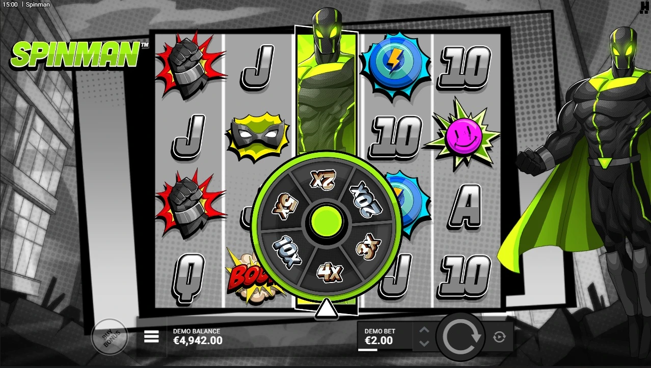 - Reel Heroes Hidden Epic Bonus Round – 5 scatter symbols – 10 free spins with at least 2 Spinman wild symbols landing each spin with a minimum of x5 multiplier