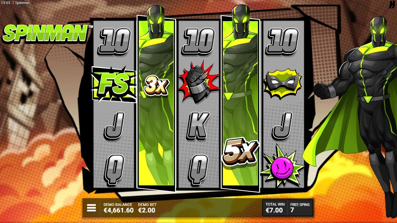 Besides low paying card symbols you will also find medium to high paying superhero symbols. Then there are the wilds, which is Spinman himself and can appear on all reels. And lastly the free spins symbols, which can also appear on all reels.