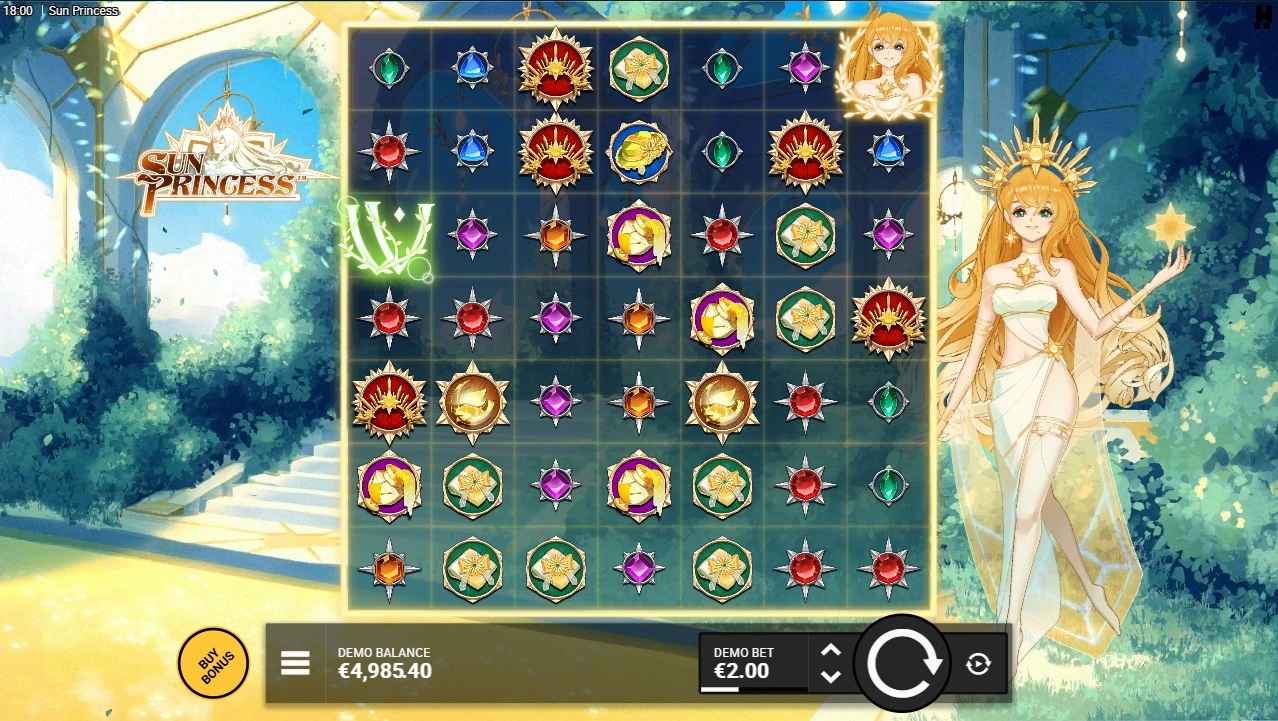 Sun Princess offers several bonus buy options. For 2x the bet you can activate a 3 times higher chance of triggering the bonus. 50x the bet will guarantee you to land a Sun Ray Frame. For 80x the bet you can buy Solaris Grove and for 200x the bet you can buy Sunfire Palace. Golden Eclipse isn’t available as a bonus buy.