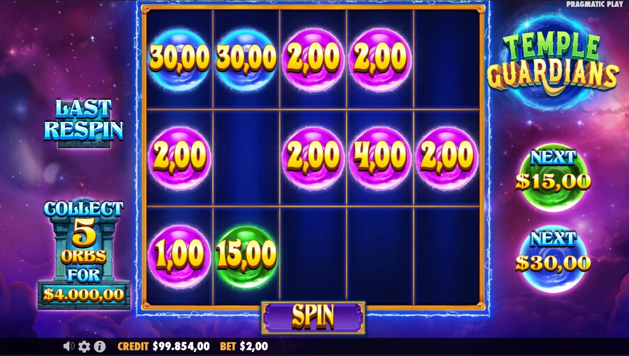 You are awarded with 3 re-spins and only blank spots and orbs appear. Each new orb will become sticky and add values to possible green and blue orbs. It will also reset the re-spins back to three.