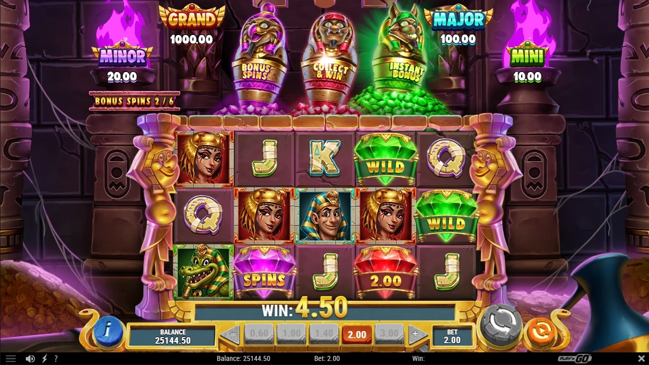 This bonus triggers at random when one or more red diamonds are collected, or when a mummy lands on reel 1 and a red diamond lands anywhere else.