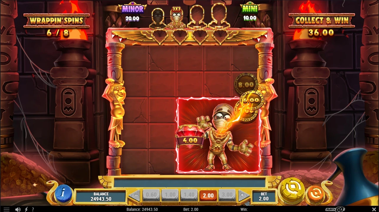 You will receive 5 free spins with a mummy that is 2×2 symbols big on the reels. When coins land within the mummy they are collected. Coins can have a value of between x1 and x10. There are also red diamonds tthat can land, they have a value of between x1 and x20. But the mummy will always walk towards any red diamond that lands and will also collected those diamonds on top.