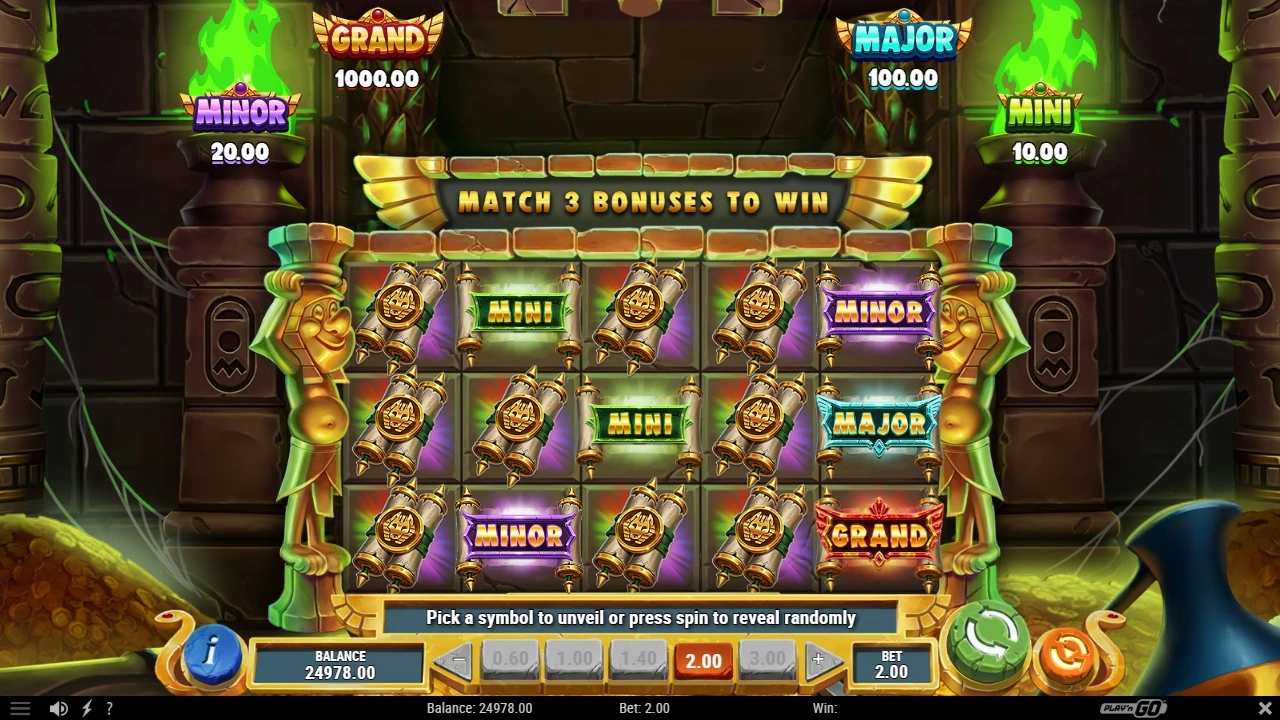 Pick spots to reveal one of the jackpots. Pick three of the same and you are awarded with the associated jackpot. Mini, Minor, Major and Grand for 5x, 10x, 50x and 500x your bet respectively.